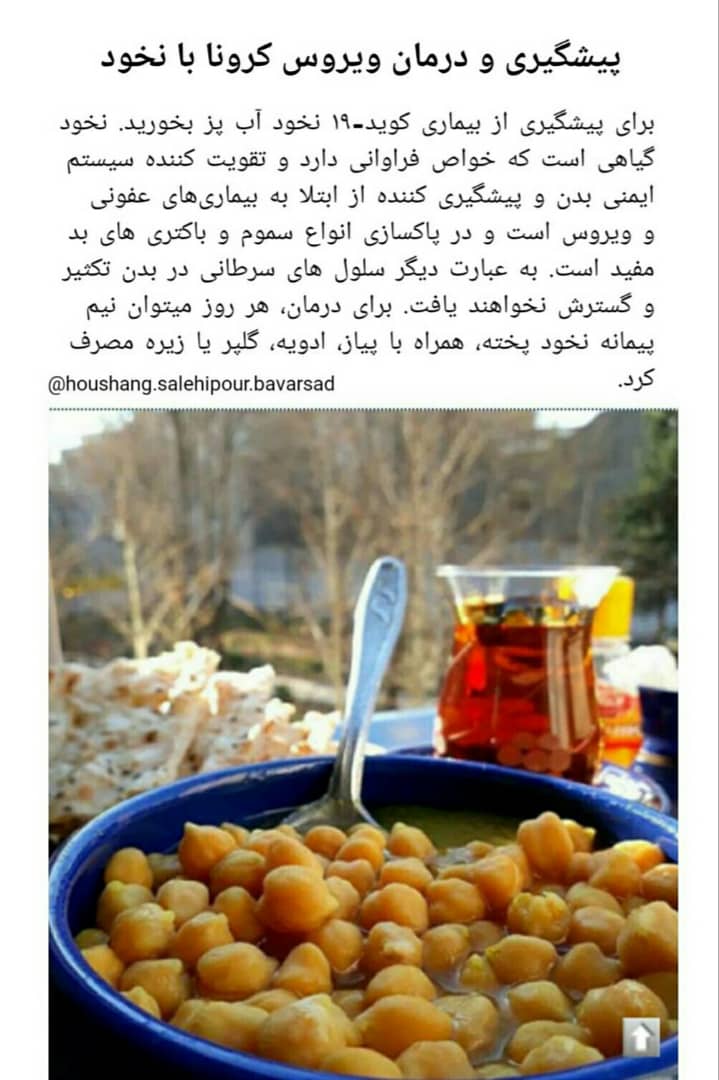 برای پیشگیری از بیماری کوید-۱۹ نخود آب پز بخورید. نخود گیاهی است که خواص فراوانی دارد و تقویت کننده سیستم ایمنی بدن و پیشگیری کننده از ابتلا به بیماریهای عفونی و ویروس است و در پاکسازی انواع سموم و باکتری های بد مفید است. به عبارت دیگر سلولهای سرطانی در بدن تکثیر و گسترش نخواهند یافت. برای درمان هر روز میتوان نیم پیمانه نخود پخته همراه با پیاز، ادویه، گلپر یا زیره مصرف کنید. (بیماران بهتر است با پزشک خود مشورت کنند)