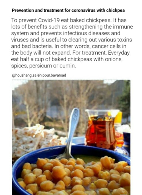 To prevent Covid-19 eat baked chickpeas. It has lots of benefits such as strengthening the immune system and prevents infectious diseases and viruses and is useful to clearing out various toxins and bad bacteria. In other words, cancer cells in the body will not expand. For treatment, Everyday eat half a cup of baked chickpeas with onions, spices, persicum or cumin.